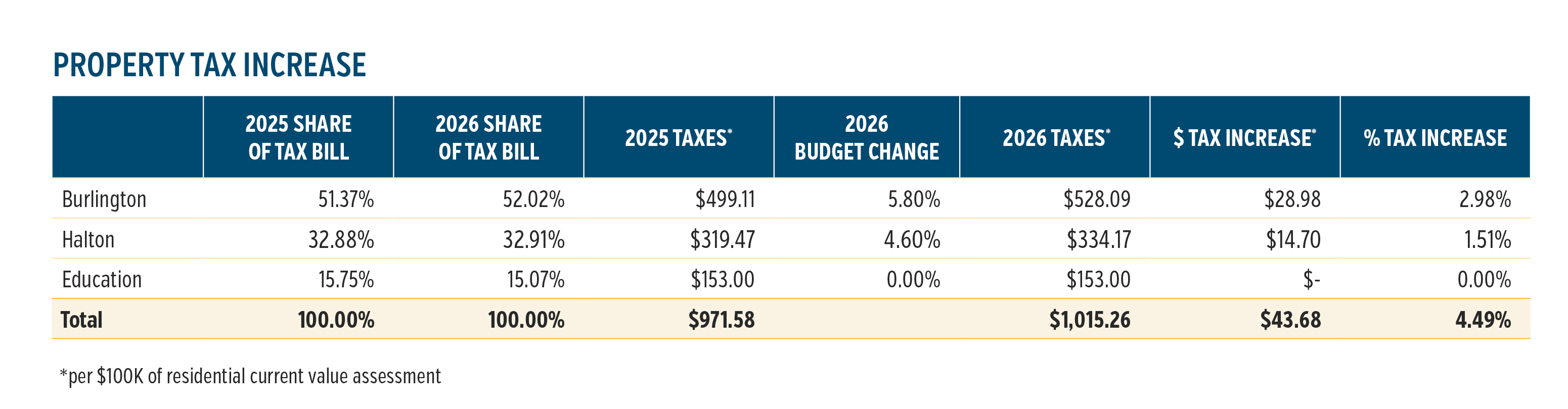 The City of Burlington’s proposed 2026 Budget includes a 5.80% increase in the city’s budget and results in an overall property tax increase for residents of 4.49%. This percentage includes services delivered by the City of Burlington, Halton Region (including Police Services), and the Boards of Education and represents the impact residents will see on their property tax bill.